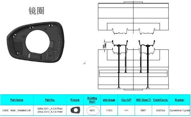 模具結(jié)構(gòu):鏡圈產(chǎn)品一般無結(jié)構(gòu),此車型鏡圈產(chǎn)品無行位斜頂結(jié)構(gòu)