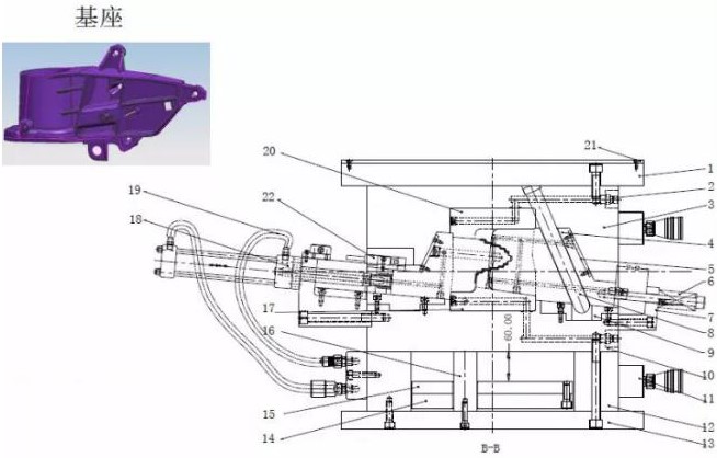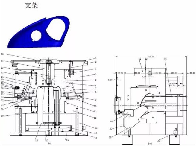 本模具采用推桿+推塊+推塊推出的脫模機(jī)構(gòu),這是汽車后視鏡支架模具的典型結(jié)構(gòu),設(shè)計(jì)本類模具要注意,這種結(jié)構(gòu)必須是手工