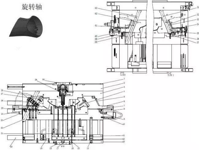 本模具采用推桿+推塊+斜推塊推出的脫模機(jī)構(gòu),這是汽車后視鏡鏡殼模具的典型結(jié)構(gòu),設(shè)計(jì)本類模具要注意,這種結(jié)構(gòu)必須是手
