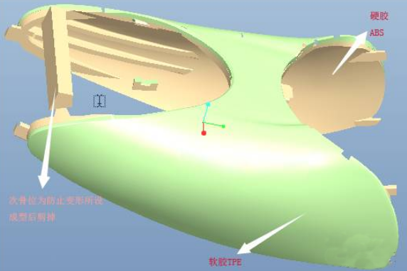 硬膠ABS采用兩點進膠,一點位于塑件頂部,成型后被軟膠TPE所覆蓋,另一點在工藝骨位上,最后被剪掉。軟膠TPE一點進膠,同樣在塑件的頂部邊緣,成型后產(chǎn)品組裝時可以被蓋住。